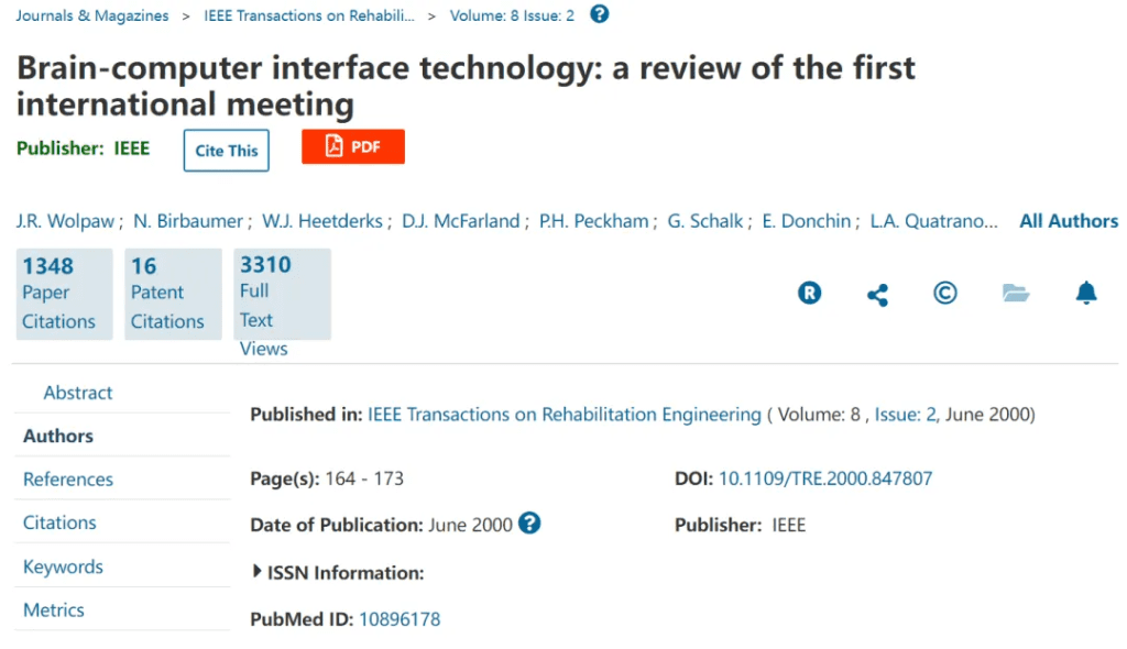 脑机接口通讯速率大概是在2005年是第一次被报道出来,美国科学家Wolpaw在2000年的综述里给出了脑机接口的信息传输率(Information Transfer Rate,ITR)公式,到2005年才有第一篇文章给出具体数值,当时报道的传输速率是1-2 bit/min,当时用的单位是bit/min,比现在的bit/s要低60倍。