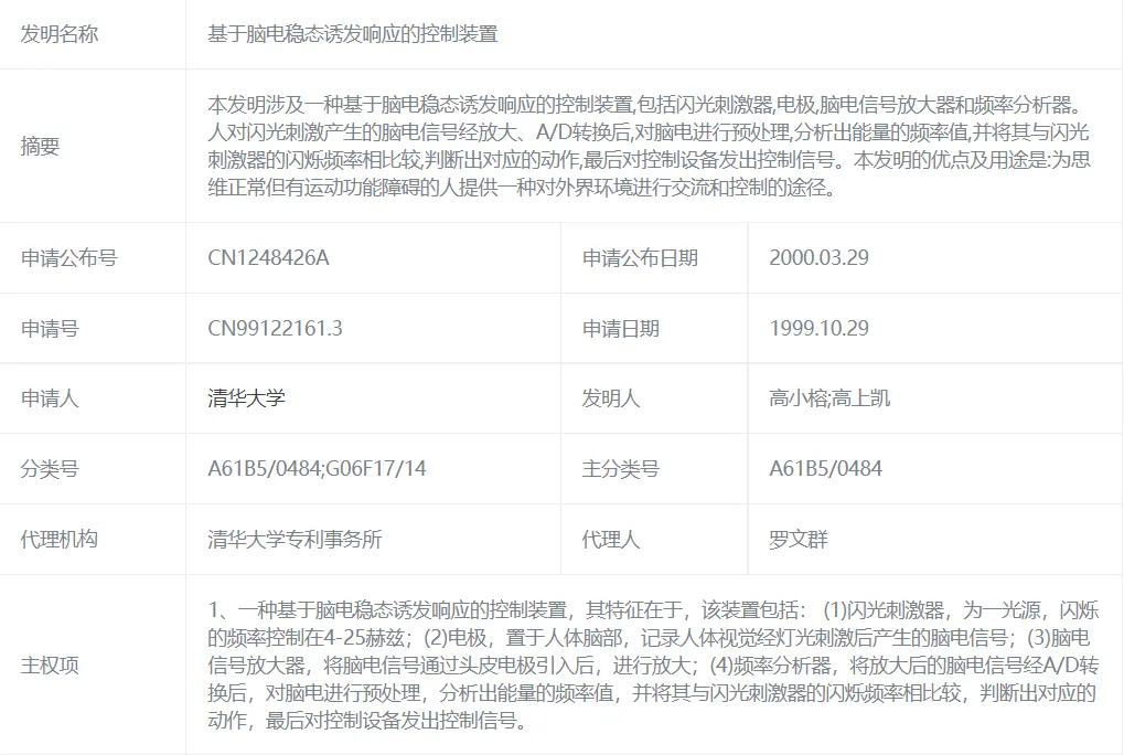 高小榕:在从事脑机接口之前我们做过视觉诱发电位的研究,后来就叫脑机接口。当时我们做这个项目时还不知道这个技术叫脑机接口,即使到2006年申请美国专利的时候,也没用BCI(Brain Computer Interface,脑机接口)这个词,因为脑机接口对当时的广大研究者来说,都是很陌生的一个词,我们用“感觉相关的脑电活动”这样一个词来申请的专利,所以即使现在多数做脑机接口研究的人员做专利检索的时候,都查不到我们这个专利。
