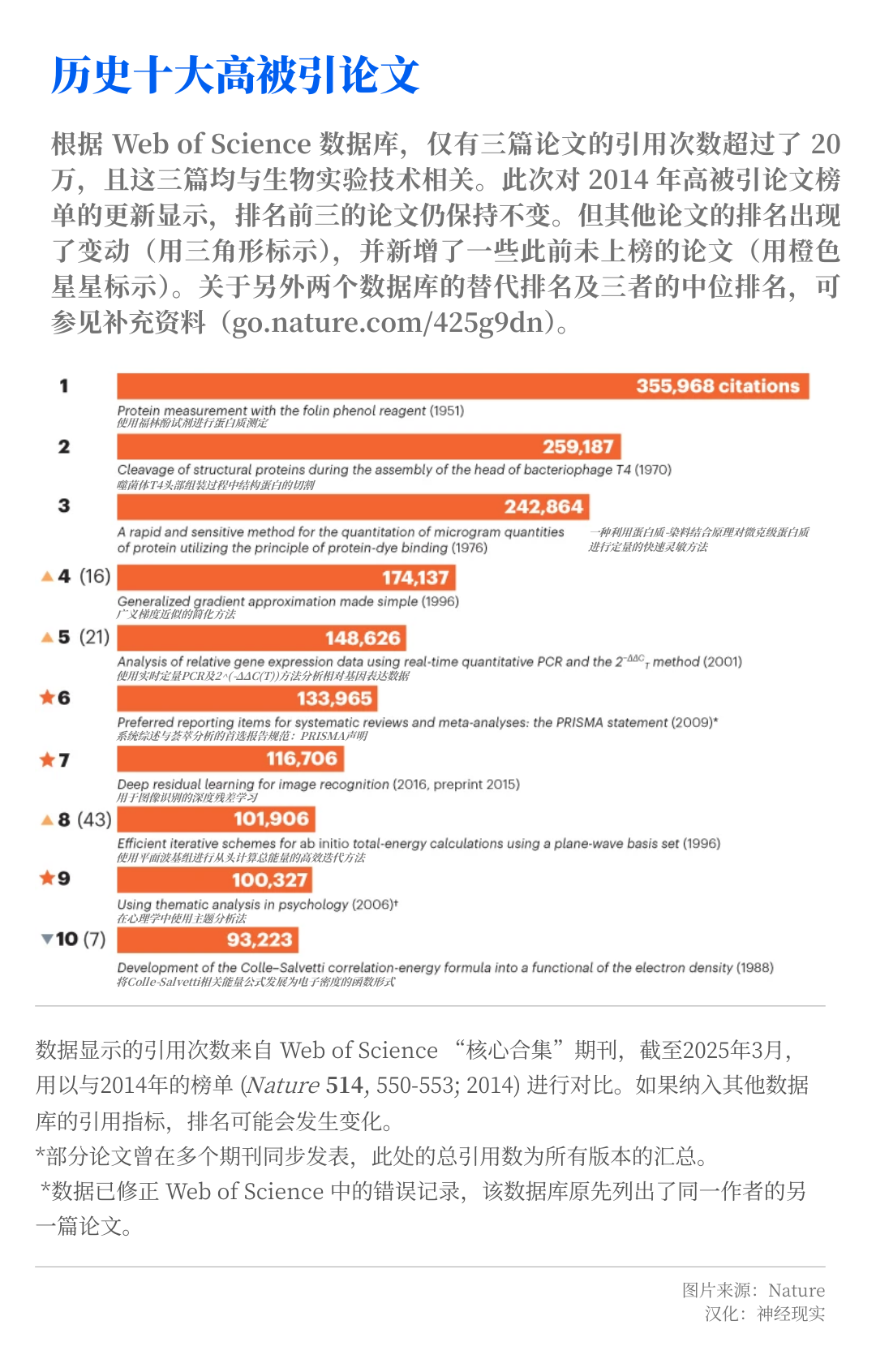 早在2014年,《自然》杂志就已统计过史上被引次数最多的100篇论文,他们发现最知名的一些研究并未入选,例如发现高温超导体和DNA双螺旋结构解析等获得诺奖的研究。相反,上榜论文多是生物医学和统计学领域中实用性极强的技术方法,例如Lowry蛋白质测定法、Sanger测序法和PCR等。此外,像BLAST和Clustal这样的生物信息学工具、用于绘制进化树的邻接法、以及Kaplan–Meier和Cox模型等统计方法也位列其中。榜单还显示,计算机的发展推动了这些方法的普及,而工具类软件、数据库和统计模型往往能获得远超基础科学突破的引用量。