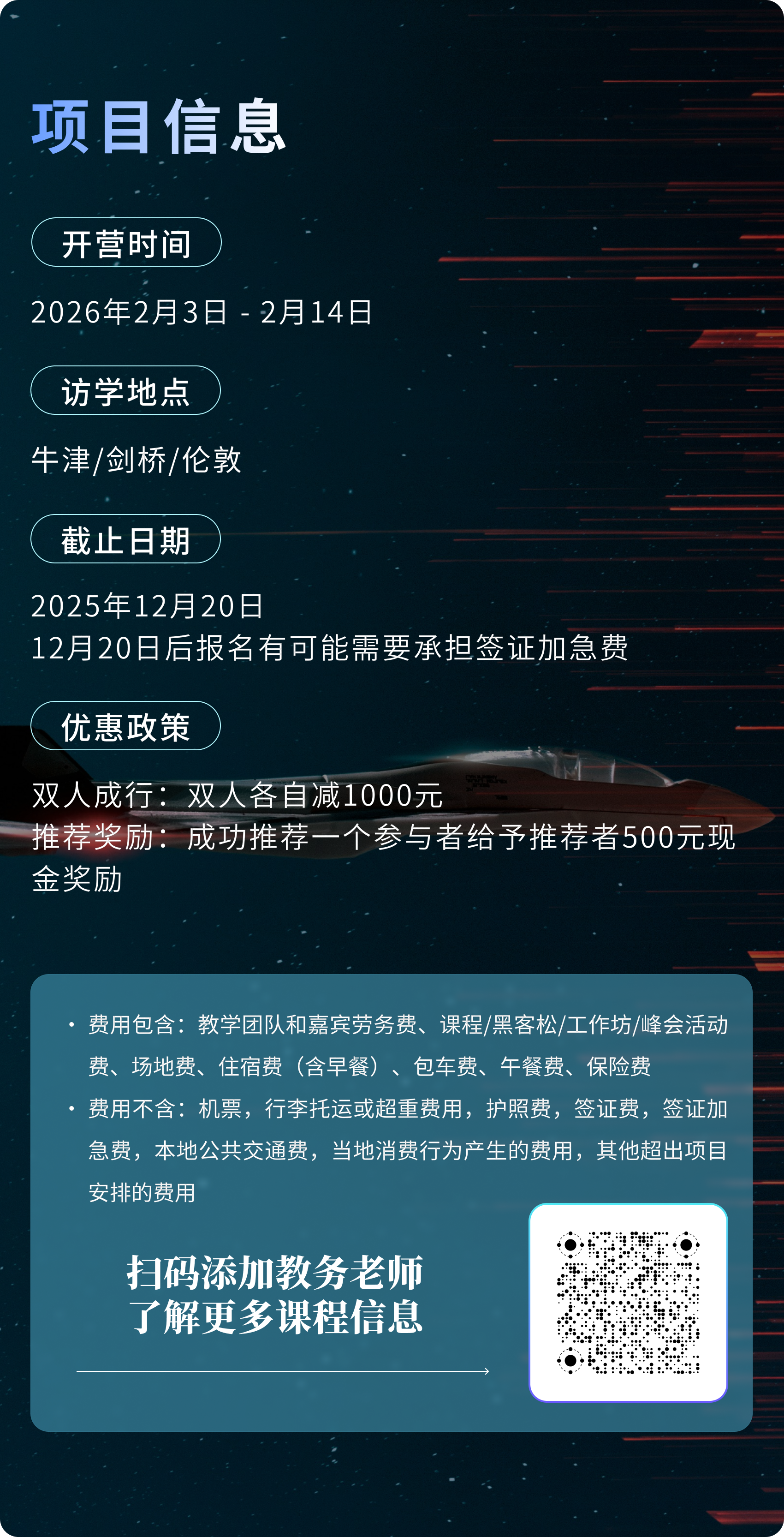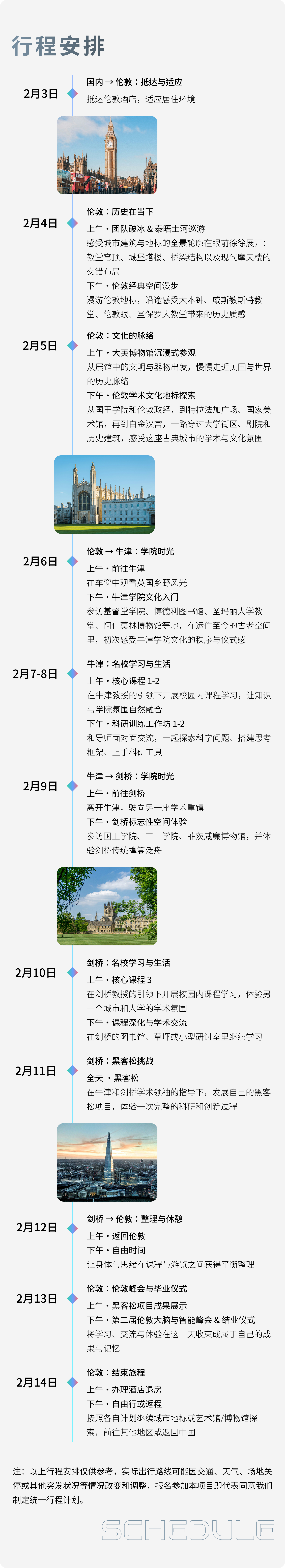 - 我们将统一安排访学期间的酒店(包括牛津、剑桥和伦敦地区)住宿,费用包括2026年2月3日至2月14日(12天11晚)的酒店住宿费,住宿期间提供早餐;